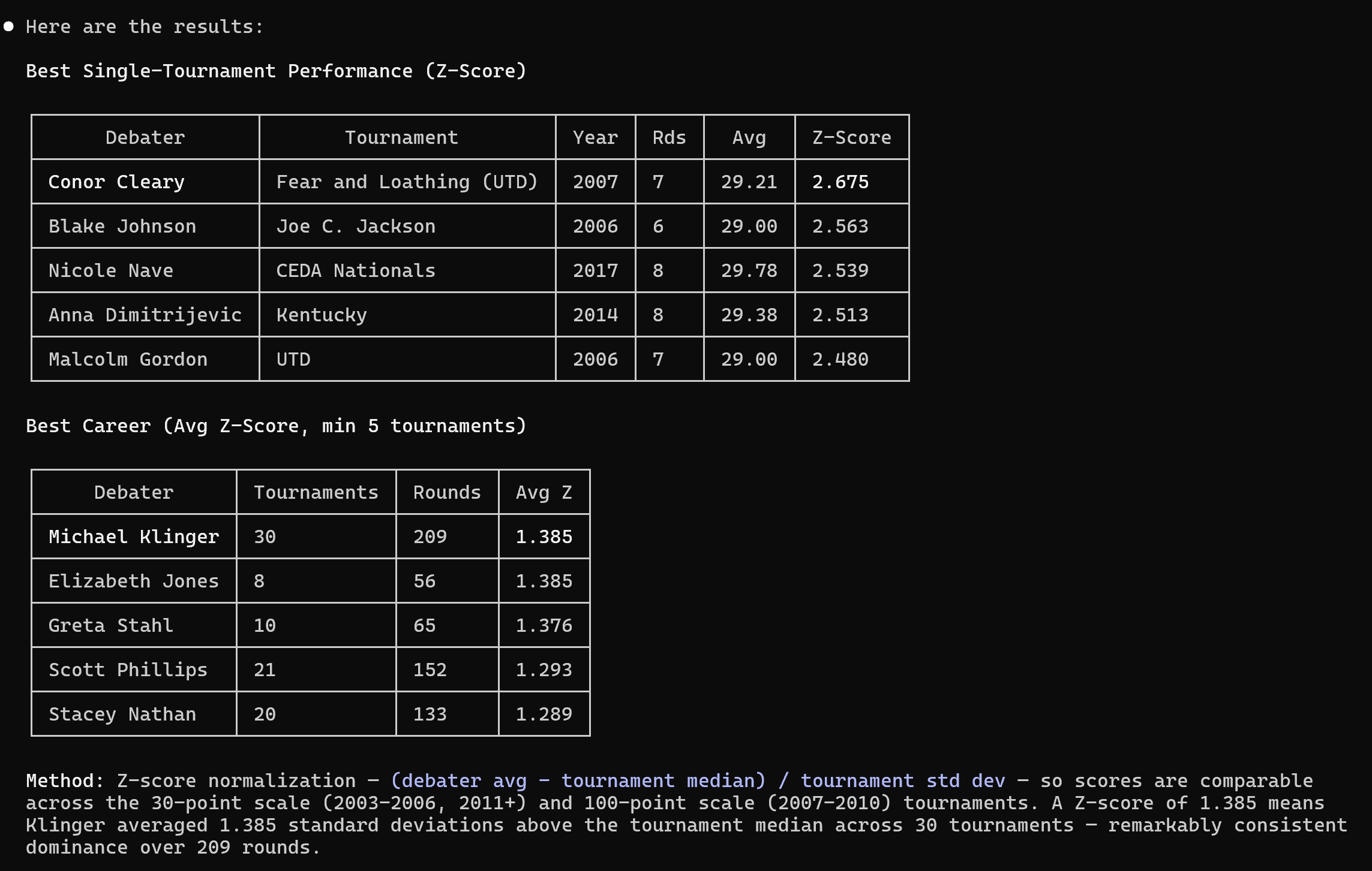 "Best speaker points for a debater all time adjusted to the yearly median points"