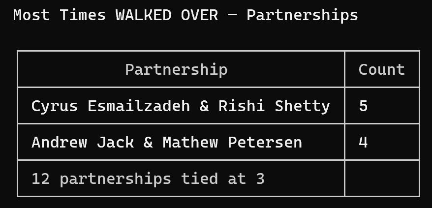 Most walked over partnerships: