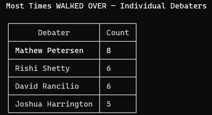 Most walked over debaters: