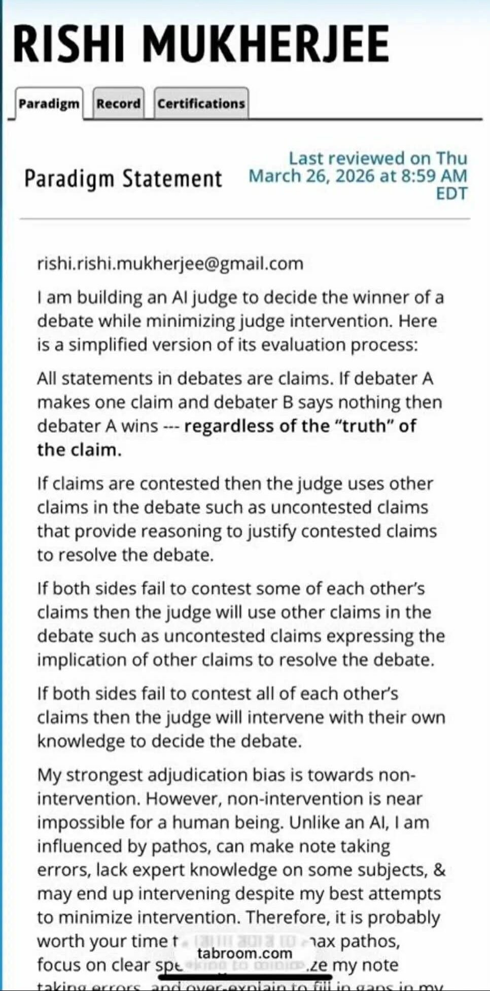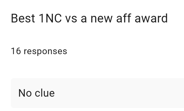 I am obviously not going to go dumpster diving into judge philosophies when I no longer fill out pref sheets. This award will not be given.