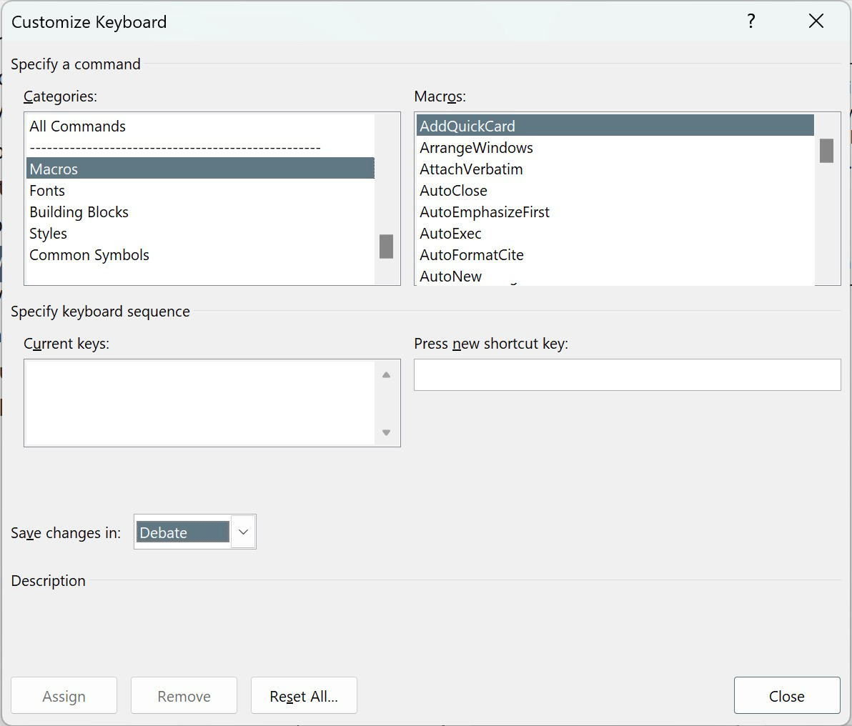 - To change the keyboard shortcut for any macro, go to Verbatim Settings, Keyboard, Other Shortcuts. Save changes in 'Debate' and navigate to the Macros section. Your screen should look like this; find the macro you are interested in, add your shortcut, and click 'Assign.'