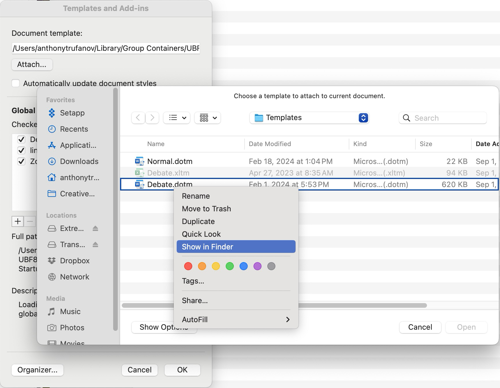The easiest way to find your Templates folder on Windows is to install Everything Search and look for 'Debate.dotm.' The easiest way to find it on Mac is to open a Verbatim document, search the options for 'Templates and Add-ins,' click 'Attach...', right click any file in the folder that opens, and choose 'Show in Finder' from the context menu.