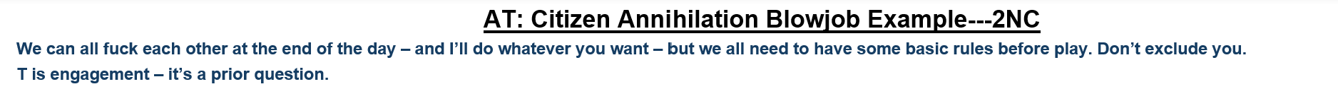 We must increase our derogatory references. Now, can I blame negative teams for taking the win if the affirmative is going to lose on "sky is blue, vote neg"? Yes, yes I can, and I will. I will make two points.