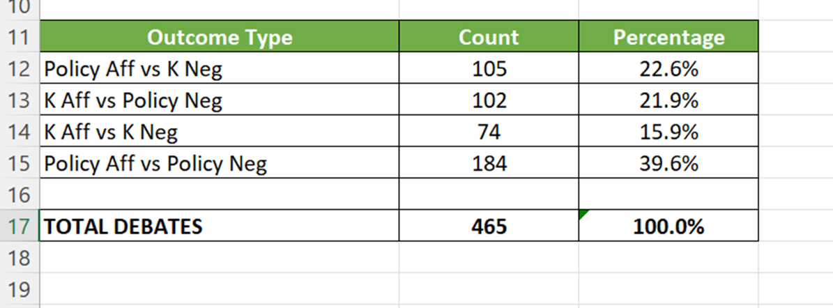 These groupings are not perfect, because they ignore flexible teams. Sometimes Policy Neg is going for the Cap K. Sometimes K Neg is going for a CP or procedural or impact turn. Maybe there are teams that switch between reading a plan and not reading a plan, but that did not appear to come up as I investigated.