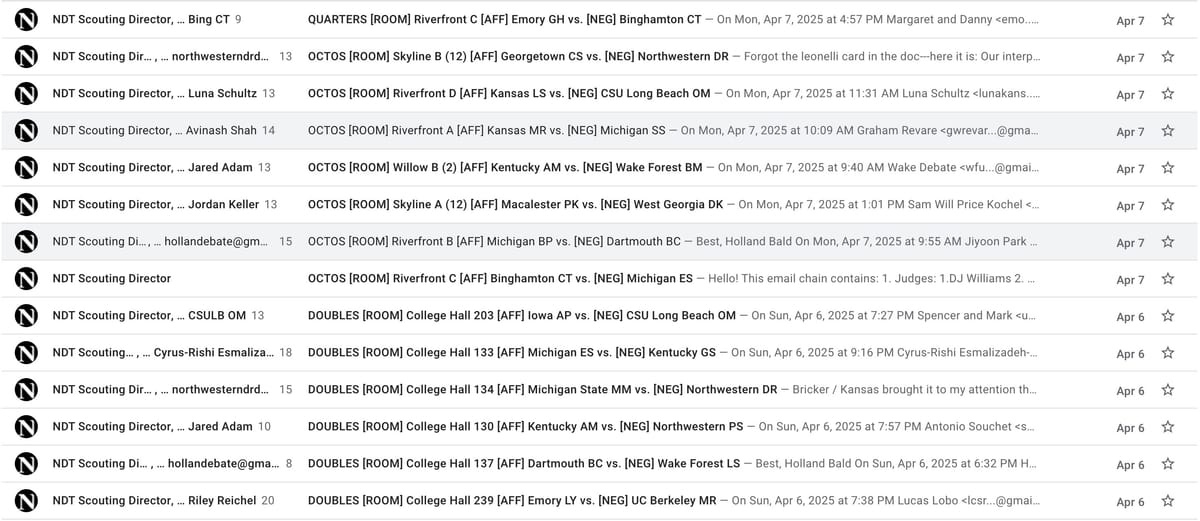 But this is clearly still second-best. It worsens the Varsity Octos and JV/Novice Quarters pools by shrinking them. It forces people who are in for zero because their job is to handle logistics to judge during a time slot where coaching and logistics demands often spike. It is opaque and unintuitive. Not everyone is dialed into the details of the schedule, especially if they don’t have JV/Novice teams of their own.